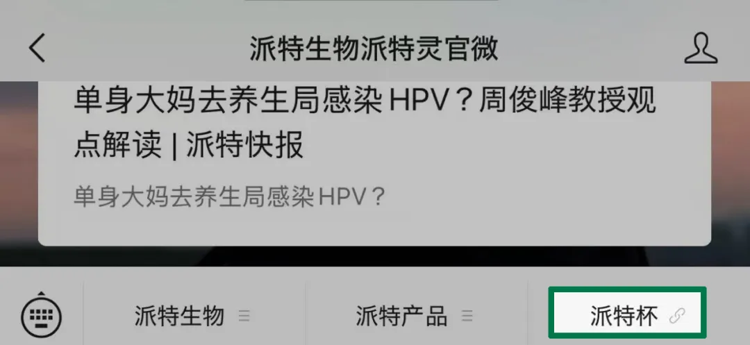 點擊“派特生物派特靈官方微信”底部“派特杯”按鈕